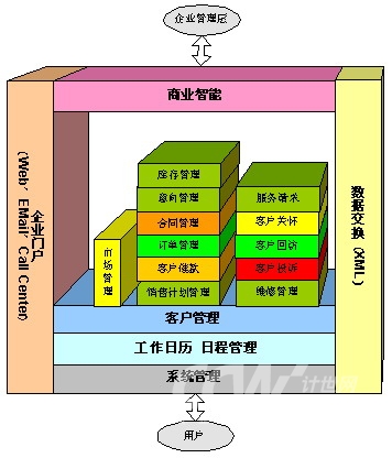 企业门户:是面向客户、合作伙伴和供应商的信息交换平台,包括WEB方式、E-MAIL方式、CALL CENTER方式等。WEB方式可实现功能:商品档案查询、新产品发布、网上订单提交与查询、网上维修服务请求与查询、网上企业公告、网上投诉与反馈、网上咨询、网上市场调查等。