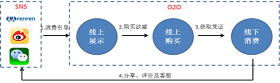 从SNS+O2O协调服务模型可以看出,SNS处于O2O服务上游,通过社交媒体的强关系链和精准营销引导客户线上消费并提供O2O服务入口。客户通过SNS进入O2O订购渠道,线上购买后到线下消费,再回到线上对服务进行评价和在SNS社区分享体验。这个过程实际上是O2O2O,即Online to Offline to Online,线下服务后再回到线上,对于SNS关系链的维护和客户关怀至关重要,是整个服务的完整闭环。