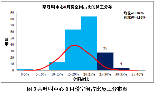 如图3所示,该呼叫中心人均空闲占比为20.84%,较行业标准值14%偏高,原因有二:第一,该呼叫中心24小时提供服务,每日22:00-次日7:00为话务低谷,该时段空闲占比高;第二,8月该呼叫中心业务量较为集中,为保证良好的客户体验而将接通率指标定为96%,远高于行业85%的标准值,为此加大了人员排班投入。