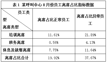 3、离席占比:包含培训离席、班务离席、就餐离席及休息离席占比四类,即相应离席时长/签入时长。其中培训离席占比反映了座席代表在话务工作外接受的培训强度,班务离席占比反映了班长从事班组管理工作的强度。