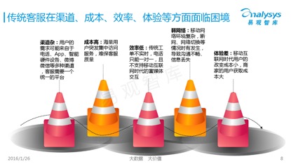 但是传统的客服在渠道、成本、效率、体验等方面面临种种困境,比如渠道杂,用户的需求可能来自于电话、APP、智能硬件设备、微 博、微信等多种渠道,客服需要一个统一的平台;成本高,海量用户突发集中访问服务,难保客服质量;效率低,传统工单不实时,电话只能一对一,且不支持移动互联网时代的富媒体交互;体验差,移动互联网时代用户的改变成本小,商家的用户获取成本大等等。