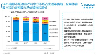 爱 客服正是在2015年8月份进入SaaS市场的,易观国际预测SaaS客服将在2016年进入市场启动期,客户服务中心将全面转型为全媒体客服,市场规模 将在2017年达到680亿元人民币,移动端客服将占整体SaaS客服市场7.9%的市场份额,全媒体客服将占据市场12.3% 的市场份额。