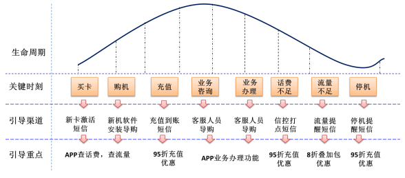B、对于活跃客户或新客户,可以描绘客户在移动通信过程中特点场景和需求,针对不同场景开展MOT提醒和刺激。以下是基于客户生命周期的各大触点、渠道和业务引导的示意图,通过MOT传播,实现客户-渠道-业务三者的匹配。