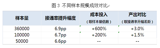 进入大数据时代,对于样本规模的考量往往只有一个答案——无需抽样,直接使用全量数据。站在实际运营的角度,样本规模越大,意味着数据处理、模型搭建等各环节需要投入的时间和精力越多,模型对于业务变更的响应速度越慢。是否真的有必要使用全量数据?缩减样本规模是否也同样可以实现精准识别?我们尝试使用5万、10万和36万3个不同规模的样本,搭建判别式模型,从下图可见:接通率提升幅度与样本量呈正相关关系,对“大数据”的强调存在统计意义上的合理性;但从成本和产出的增速来看,600%的额外投入仅能带来3%的提升。其中的得与失目前并无统一的评判标准,建议呼叫中心决策者依据企业实际情况,具体问题具体分析。