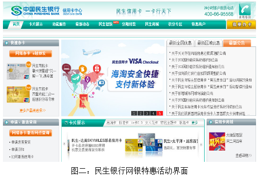 体验中发现,几乎所有银行官网上均专门设置了特惠信息栏,但在客户查找的直观感知度上却不尽相同。能将网站界面分布合理并能使客户快速查找到的银行有民生银行信用卡官网。该网站在首层菜单下设置了优惠活动的图片滚动栏,在右侧边将优惠栏目划分为三类:最新全国优惠、最新区域特惠及最新公告,分类清晰,能使客户一目了然的查找到自己所需信息。如下图: