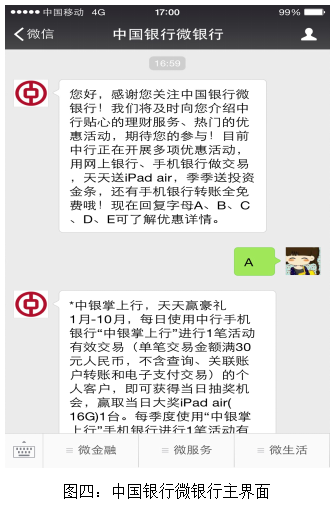 在微信的优惠活动界面里,人性化设计突出的是中国银行。以下是添加“中国银行微银行”公众号后的弹屏,直接将该行开展的市场活动进行推送,活动内容详尽饱满,底层三个菜单也使用了当下主流的“微金融”、“微服务”、“微生活”三个分区。