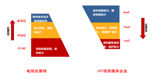 运营商优势在基础层,从价值传递方向看,是至下而上的;而互联网企业的优势在于业务层,从价值传递方向看,是至上而下的,如图1所示。