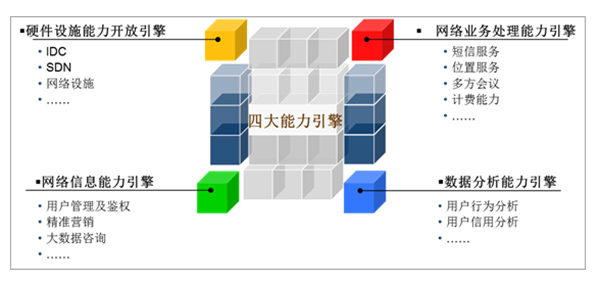 从能力开放的角度,运营商应重点形成四大能力引擎:硬件设施、网络业务处理、网络信息和数据分析。