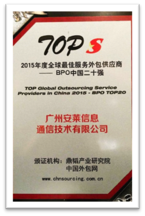 安莱信息成功入围2015年度全球最佳服务外包供应商中国五十强和2015年度全球最佳服务外包供应商BPO中国二十强