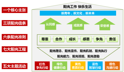 客户服务(东莞)中心继承已有文化传统,参照马斯洛需求层次理论,结合一线实际情况,从员工实际需求出发,创建五色阳光文化管理体系,该体系由红色:荣誉价值彰显体系、橙色:和谐友善沟通氛围、黄色:素质爱好发展平台、绿色:健康文明生活体系、蓝色:智力能力发展水平五部分构成。