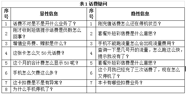 因客户自身原因,客户咨询的问题千差万别,同样的问题会有不同的表述方式。通过录音抽检发现,客户咨询本机业务、要求开通业务、话费疑问、优惠活动的咨询量较大。以话费疑问举例,我们将客户的咨询方式总结为15种,归纳为显性信息和隐性信息两大类(如表1)。显性信息是指客户的表述直指客户核心需求,可以直接根据客户的表述进行答复;隐性信息是指客户的表述并非核心需求,员工作答后,客户才逐步讲出核心需求。