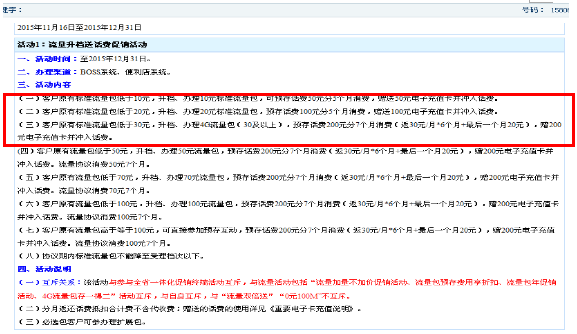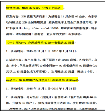 (1)营销活动。因全省及地市营销活动繁多、营销活动宣传群发语模糊,导致客户来电所描述的活动与实际的营销活动存在偏差,员工无法尽快识别。以流量升档送话费活动为例,客户接收到的群发信息是: