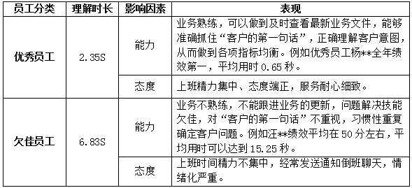 通过听取录音,其中优秀员工理解客户诉求的平均时长为2.35秒,欠佳员工理解客户诉求时长为6.83秒,时差为4.48秒(如表3)。