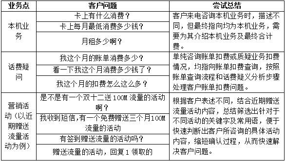 客户来电咨询话费账单问题时首先会询问“你看我这张卡上有什么业务?”“我刚才充值的话费充上了吗?”“我的话费余额多少?”在这种情况下,员工要针对客户诉求进行答复,但实际上客户是对本机话费有疑问,客户多样化的询问方式影响了员工理解客户诉求的时长。