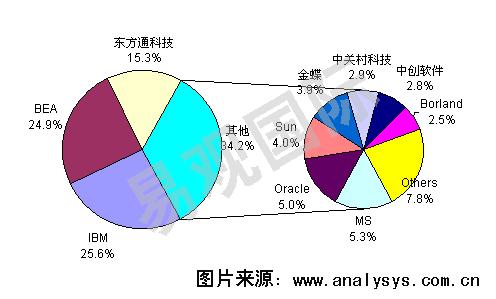 在厂商排名中,仍然由IBM、BEA、东方通三家公司占居前三名,并占据市场总份额的65.8%。其中IBM超过BEA成为市场第一名。由于BEA在市场开拓方面不强,所以在第一季度的排名中下降至第二。国产厂商中,东方通科技公司仍然占据第一名的位置。