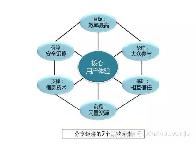 从分享经济发展的内在需要来看,有七个关键要素:闲置资源是前提,用户体验是核心,信任是基础,安全是保障,大众参与是条件,信息技术是支撑,资源利用效率最大化是目标。