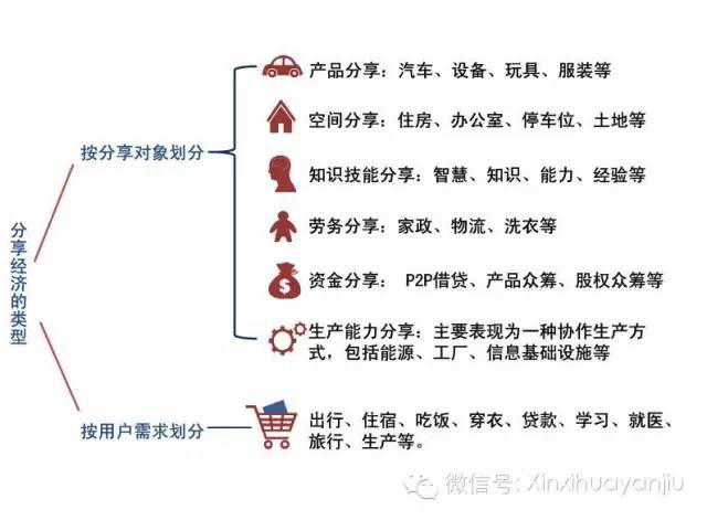 6、生产能力分享,主要表现为一种协作生产方式,包括能源、工厂、农机设备、信息基础设施等,代表性平台企业有Applestore、Maschinenring、沈阳机床厂I5智能化数控系统、阿里巴巴“淘工厂”、WiFi万能钥匙等。 从满足用户需求的角度,分享经济也可以划分为以下种类:出行(滴滴出行/Uber)、住宿(Airbnb/小猪短租)、吃饭(回家吃饭/妈妈的味道)、穿衣(Rent the Runway/那衣服)、贷款(LendingClub/人人贷)、学习(Coursera/MOOC中国)、就医(春雨医生/名医主刀)、旅行(蚂蜂窝/百度旅游)、生产(Applestore/淘工厂)等。