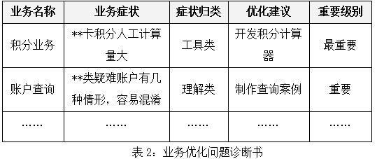 我们将各渠道收集的意见及建议进行汇总,并分析归类,剔除重复及无效数据,形成业务优化问题诊断书,以便开展分析会议及后期反馈优化进度给员工(如表2)。