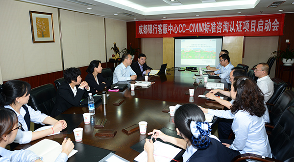 2016年5月18日,成都。今日,成都银行客户服务中心举行CC-CMM国际标准认证项目启动会,正式接轨CC-CMM客户中心能力成熟度模型国际标准。成都银行副行长蔡兵,电子银行部总经理王庆,电子银行部副总经理刘昕,客户服务中心经理詹蓉等客户服务中心运营管理团队成员,客户世界机构创始人、CC-CMM国际标准组织主席赵溪,CC-CMM国际标准认证机构执行总监葛舜卿,项目组成员郭静和周月词出席了会议。