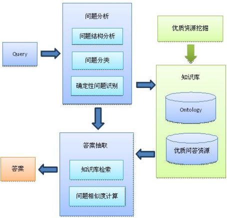 一个自动应答系统包括问题分析、答案抽取、知识库这三个主要模块。用户的问题依次经过问题分析、答案抽取这两个模块的处理。问题分析模块对用户的提问进行分析,确定问题的语义类型,预测答案的类型,例如答案是回答人物、时间、地点或者还是回答人物的年龄、商品的价格等;判断用户的提问是否为确定性问题,对于有明确具体答案的确定性问题,分析问题的结构并直接定位用户的所求。答案抽取模块从知识库中检索问题的答案并返回给用户。对于确定性问题,根据问题的要点直接检索Ontology并返回答案;对于非确定性问题或者未找到答案的确定性问题,通过检索优质问答资源获取答案,即计算用户的提问与优质问答资源中的问题的相似度,获取相同问题或同义问题,直接返回满足提问的答案。