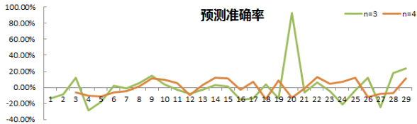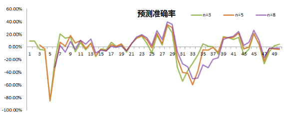 分别取n=3、n=5、n=8计算出预测值、预测准确率、误差平方,预测准确率按照“(实际值-预测值)/实际值”计算得出三条预测准确率曲线(见图五),经计算,预测准确率在±15%范围的个数占比分别为66.00%、62.50%、46.67%,准确率都较低(见图五)。