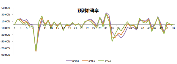 下图为α=0.3 、α=0.5、α=0.8时运用一次指数平滑法的试算,见图十。其中S1用X1代替,故序号1中α取任意值,该点的预测准确率均为0.00%,不计入试算点的占比中。由图可见,α取不同值时,预测准确率差异不大,计算得预测准确率在±15%范围的个数占比分别为66.67%、70.59%、76.47%,准确率相对前两种方法有改善。