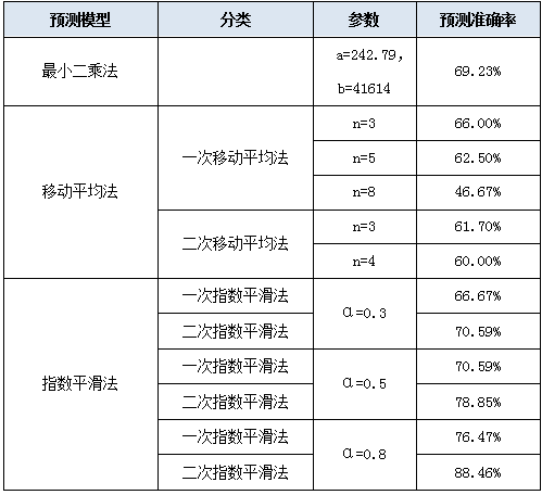 本次使用三种预测模型,分别为最小二乘法、移动平均法和指数平滑法。下面分别从原理、公式和不同参数试算验证准确性进行阐述。