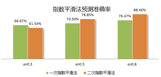 由一次移动平均法和二次移动平均法得出的预测准确率对比图,可见,在项数n的选择上,n越大对预测的平滑影响越大,滞后于实际数据的偏差也越大,n太小不能有效消除偶然因素的影响。移动平均法预测在该次数据试算中预测准确率表现不佳。
