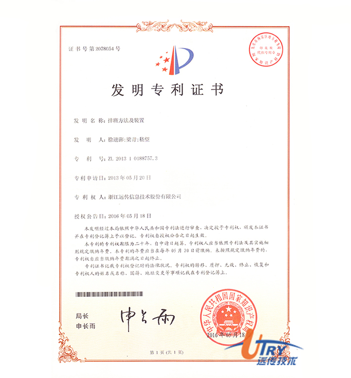 近日,远传技术研发的“排班方法及装置”荣获国家知识产权发明专利,该项产品是由远传技术自主研发,同时也是国内首创。