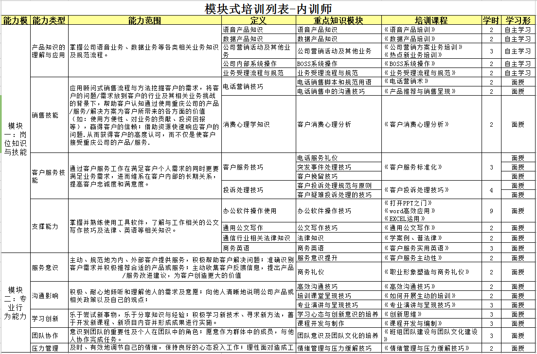 附表1-客服人员模块学习列表