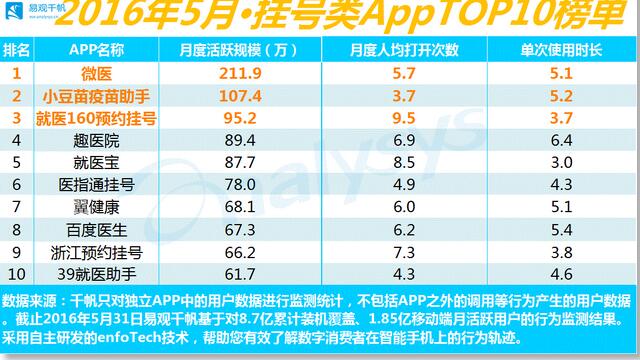 基于易观千帆2016年5月移动应用大数据,易观智库从移动医疗领域APP中,各选取了问诊、挂号领域月度活跃用户超过10万人的10款APP,按照月度活跃人数的多少来编制排行榜,微医以近212万月活跃用户名列榜首。用户下载APP后,可通过图文、电话和视频三种方式与医生在线连接咨询。
