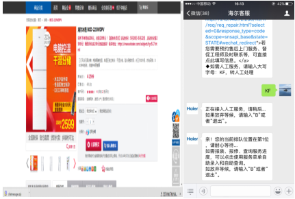 图5:海尔官网商品页面在线入口 图6:海尔微信客服人工入口