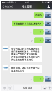 以海尔微信在线客服为例,对于懒得打字或比较急的情境下,可以发送语音交流,较好满足了不同客户群体的偏好需求(如图9)。