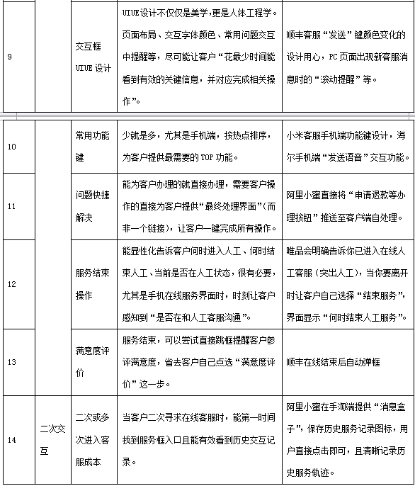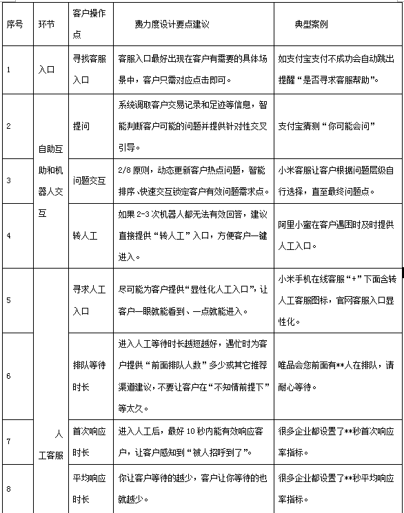 从客户寻找客服入口到最后点击确认离开,整个在线服务全流程中有若干关键环节直接影响客户体验感知,在“有效解决客户问题”和“提供愉悦感知”前提下,费力度越低,客户感知满意度相对越高。列表如下: