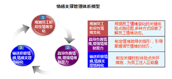 总结出影响员工敬业度的负面的关键体验时刻点之后,就要考虑如何建立起有效的情感支撑,来消除或者减少这些负面体验对员工造成的影响,在过往的实践经验中,笔者和所在的工作团队围绕这些关键情感体验时刻点建立员工情感支撑管理体系,通过在日常工作中观测员工阶段性的情绪变化,疏导负向情绪、增强情绪复原力以及输送积极情感、制定情感支撑措施等手段,对员工进行情感关怀,通过情感管理满足员工的内心需求,以期提高员工的敬业度。情感支撑管理体系模型(如图4)