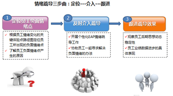 其次,及时介入疏导:当发现员工出现的一些负面情感体验时刻点,管理人员需要及时进行情绪疏导,如导入个性的面谈、一对一辅导、等EAP管理方式,开展情绪疏导工作,协助员工一起寻求解决负面情感体验时刻点的办法;