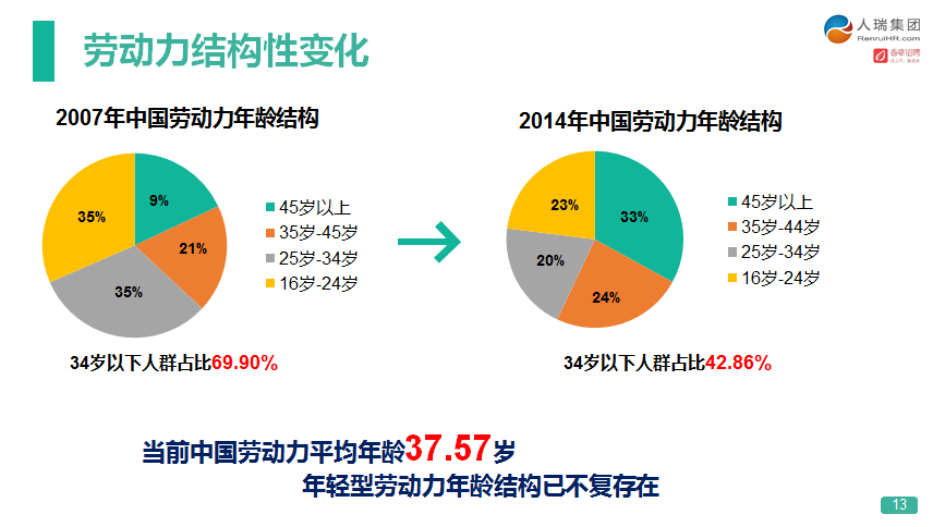 另外,中国目前社会的劳动力结构转变也为这个行业挖了“大坑”。为什么国家放开二胎?就是因为年轻人越来越少,老年人越来越多。16-20岁的年龄段在2007年劳动力市场占比为37%,2014年这个比例就变成了23%,降了14%。25-34岁之间的劳动力在2007年占比35%,现在只有20%。做呼叫中心的人群基本都在22岁左右,都是90后,这就是为什么我们感觉招人越来越困难了。