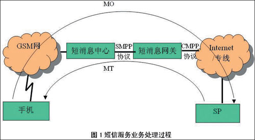 用户发短信业务(即MO业务,如信息点播等):短信中心将短信内容以SMPP协议发给连接的短信网关,短信网关根据短信发送号码(即SP的服务代码)将短信内容以CMPP协议发给相应的SP,由SP进行处理。