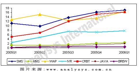 2006年第一季度,WAP 业务继续高速增长,全网 WAP 业务的信息费比上个季度增长了31.2%。但是业务存在大量不规范操作,目前 WAP 业务中自消费的比例已经高达50%,呈现出畸形繁荣。