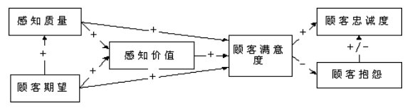 该模型是由六个隐变量组成的因果模型,其中顾客满意度是最终要求的目标变量,感知质量、感知价值和顾客期望是因变量,而顾客忠诚度和顾客抱怨则是顾客满意与否的结果变量。