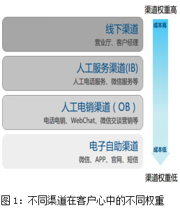 我们在观察企业向客户开放的多个服务渠道时,也发现了类似的规律,当用户在不迫切或者不是刚性需求的情况下,会采用自助的方式轻松浏览,即便有点小问题,也会通过在线交谈或微信交流的方式沟通(比如询问一下账单金额,或者快递的进度)。而一旦涉及到重大疑问或切身利益受损的情形时(比如有一笔巨额消费存在疑问,或者卡被盗刷了),往往会通过拨打客服热线,甚至直接跑到营业网点去交涉了。这就体现了不同的服务渠道在客户心目中受信赖程度和重要程度的不同(如图1)。