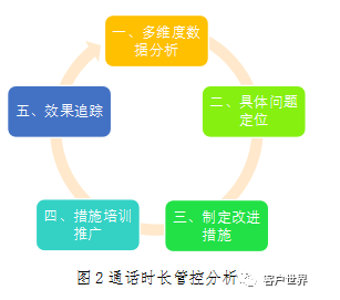 通话时长的管控重点在于管理导向是否与座席、客户需求相一致。目前有些客服中心采取计件制薪资计算方式,由服务量决定绩效,这间接对通话时长提出了要求;有的客服中心采用综合评价模式决定绩效,通话时长或话务量在绩效中占有一定比重,这种情况下,通话时长目标值设定和绩效占比很关键,直接影响座席感知和服务水平。总体来说,通话时长更多地是一个过程性指标,而非结果性指标,客户需要简洁专业的服务,而不是通话时长跟业务流程、知识支撑、座席业务能力、话术组织、安抚技巧、服务习惯、服务意识等有关,如业务流程过于繁琐,造成通话时长居高不下,但是怎样发现这些问题,并针对性地解决问题,需要明确具体思路。根据该指标的管理经验来看,主要分为:(一)多维度数据分析;(二)具体问题定位;(三)制定改进措施;(四)措施推广;(五)效果追踪,五个阶段(如图2)。