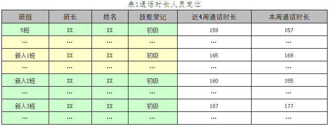 对座席个人的近期较长时间的通话时长和近一周的通话时长进行对比分析,可以发现新员工、初级员工的通话偏长的比例较大,应将他们作为优先改进对象。