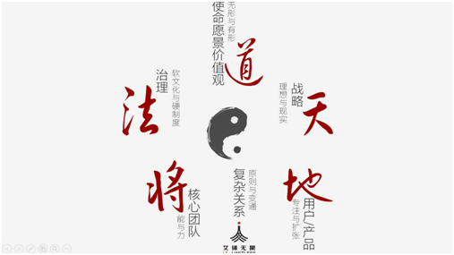 邢文斌先生将自身的创业融合了道家思想,即道(使命愿景价值观)、天(战略)、地(用户/产品)、将(核心团队)、法(治理)。