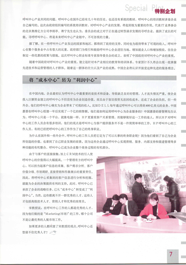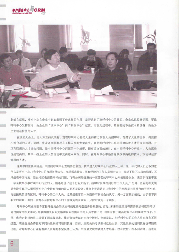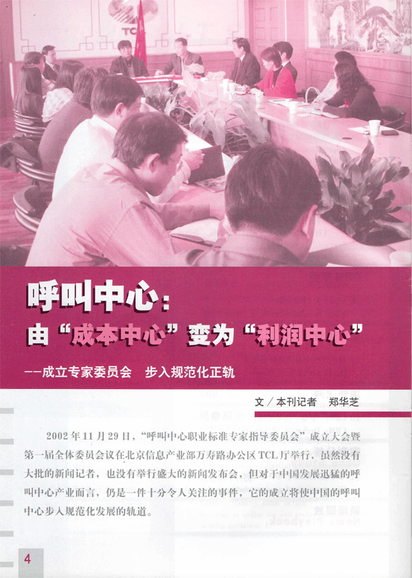 2003年1月刊的重点文章是《呼叫中心:由“成本中心”变为“利润中心”》,其背景是:2002年11月29日“信息产业部呼叫中心职业标准专家指导委员会”的成立。标准指导委员会的成立不仅仅为呼叫中心未来长久的发展奠定了基础,其委员会成员也组成了本刊的第一个“编委会”。