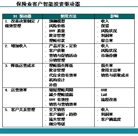站在客户立场上进行模型预测、客户获取、营销运动、流失管理、交叉销售以及客户满意度都能体现在客户分析的正确方法,进而为保险公司的实现增值。