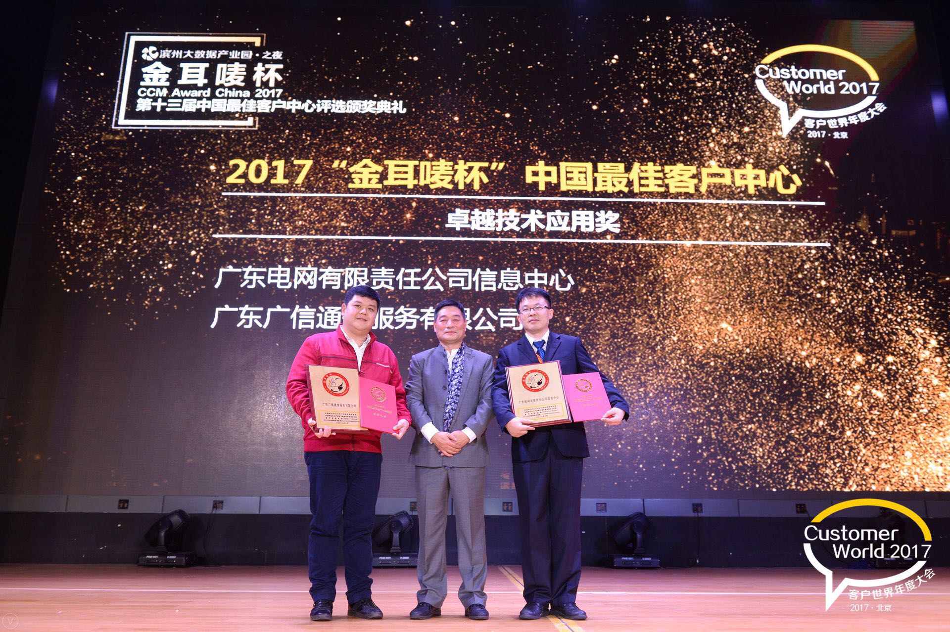 10月24日,北京。今天,国内客户中心行业历史最久、水准最高、规模最大的年度性行业会议——2017客户世界年度大会在北京荣华天地会议中心举行。以“电信九七工程”作为中国客户中心行业发展的起步标志,今年适逢行业发展二十周年大庆,当晚举行了“金耳唛杯”中国最佳客户中心评选颁奖典礼,中国工商银行、中信银行、广发银行、太平洋人寿、国家电网公司、南方电网公司、海尔集团、百度、网易、宜信、友邦保险、方正科技、科大讯飞、泰盈科技等一批知名企业客户中心获得各奖项荣誉。广东广信通信服务有限公司荣获2017“金耳唛杯”中国最佳客户中心。