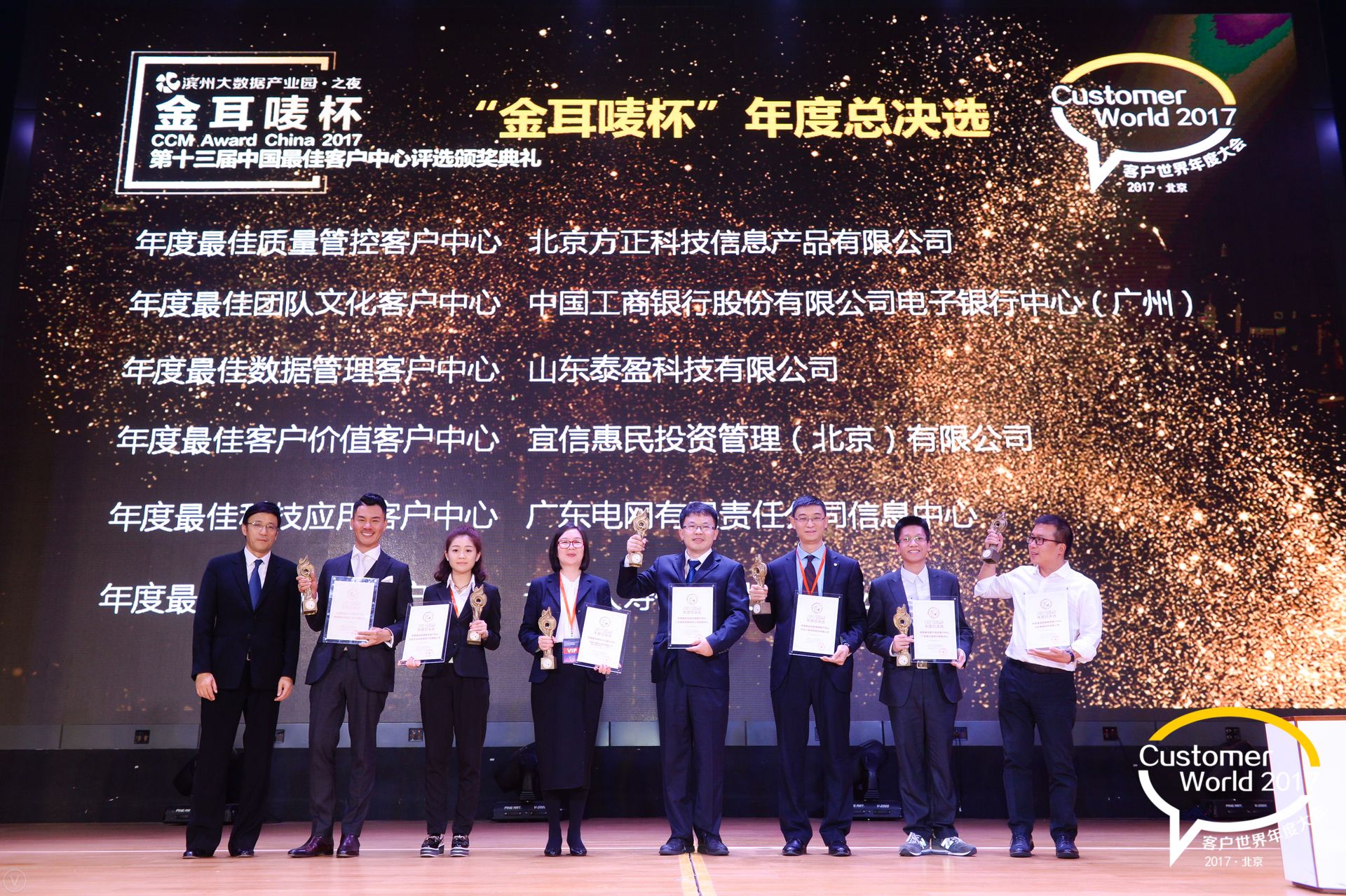 10月24日,北京。今天,国内客户中心行业历史最久、水准最高、规模最大的年度性行业会议——2017客户世界年度大会在北京荣华天地会议中心举行。以“电信九七工程”作为中国客户中心行业发展的起步标志,今年适逢行业发展二十周年大庆,当晚举行了“金耳唛杯”中国最佳客户中心评选颁奖典礼,中国工商银行、中信银行、广发银行、太平洋人寿、国家电网公司、南方电网公司、海尔集团、百度、网易、宜信、友邦保险、方正科技、科大讯飞、泰盈科技等一批知名企业客户中心获得各奖项荣誉。在“金耳唛杯”年度总决选的评选环节,中国工商银行股份有限公司电子银行中心(广州)信息中心脱颖而出、荣膺2017“金耳唛杯”年度总决选最佳科技应用客户中心。