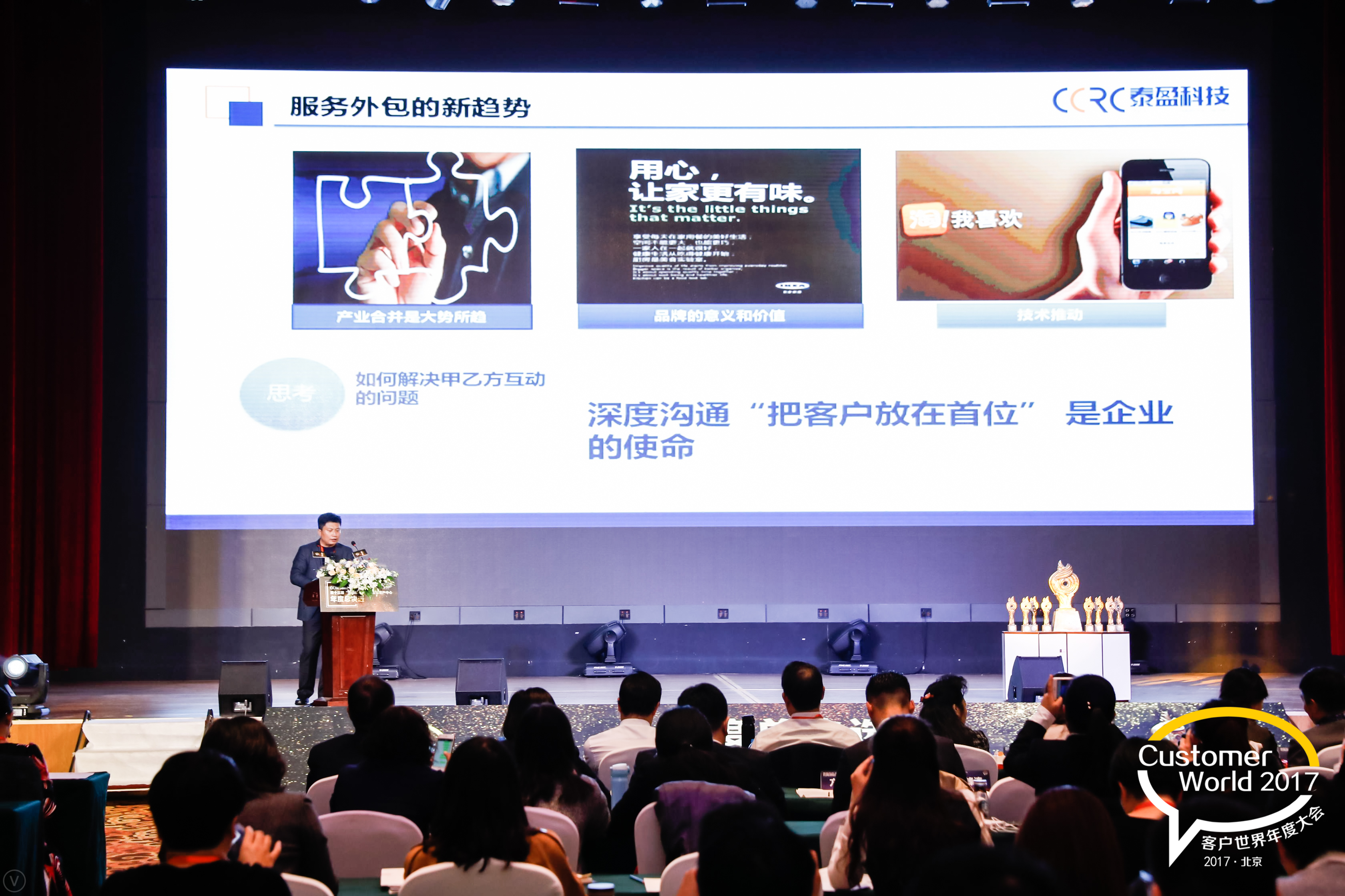 10月24日,北京。今天,国内客户中心行业历史最久、水准最高、规模最大的年度性行业会议——2017客户世界年度大会在北京荣华天地会议中心举行。以“电信九七工程”作为中国客户中心行业发展的起步标志,今年适逢行业发展二十周年大庆,当晚举行了“金耳唛杯”中国最佳客户中心评选颁奖典礼,中国工商银行、中信银行、广发银行、太平洋人寿、国家电网公司、南方电网公司、海尔集团、百度、网易、宜信、友邦保险、方正科技、科大讯飞、泰盈科技等一批知名企业客户中心获得各奖项荣誉。在“金耳唛杯”年度总决选的评选环节,山东泰盈科技有限公司荣膺2017“金耳唛杯”年度总决选最佳数据管理客户中心。