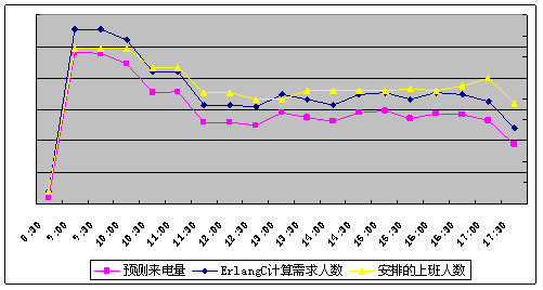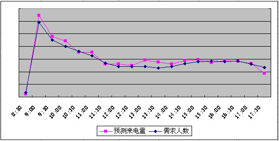 根据此工具可科学计算出每半小时要达成目标服务水平所需要配备的人员数量。如下图:人员配备的走势与预测来电的走势基本一致。